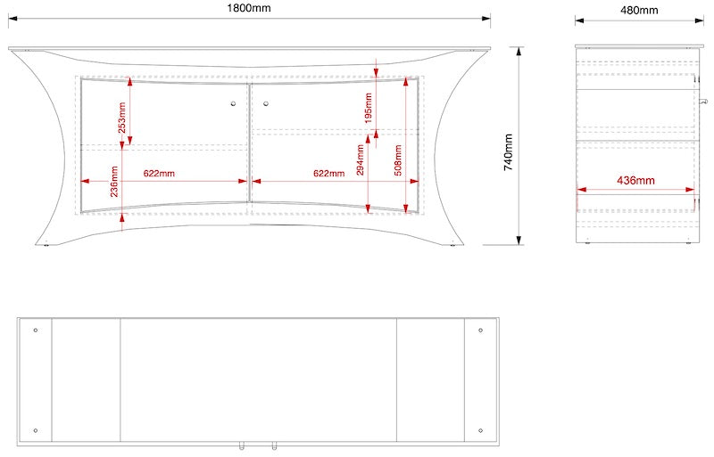El aparador Atlas presenta una forma cóncava distintiva. Esta solución de almacenamiento con tapa de vidrio presenta curvas en ambos extremos. El estante central del aparador es ajustable.