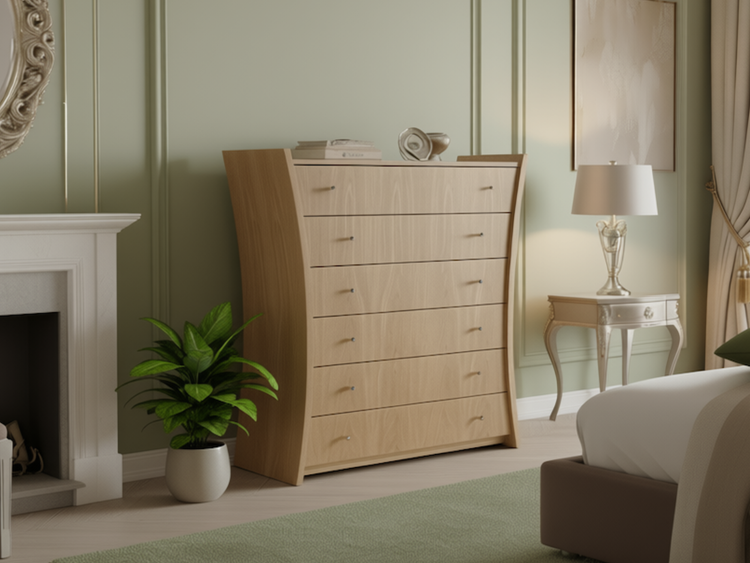 Elegante, práctica y con estilo: esta cómoda está perfectamente diseñada con una curva cóncava que realzará el aspecto de su dormitorio y, al mismo tiempo, le aportará una gran capacidad de almacenaje. Se suministra con patas regulables para una fácil nivelación. Dimensiones: 101 cm x 55 cm x 120 cm.