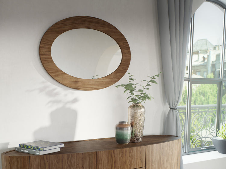 Another beautifully crafted piece from the Tom Schneider team. I have hung it above my fireplace and it looks lovely with my other purchases from the company. The oval shape is perfect and compliments my oval coffee table. The natural walnut surround is stunning. So pleased with it and worth every penny.