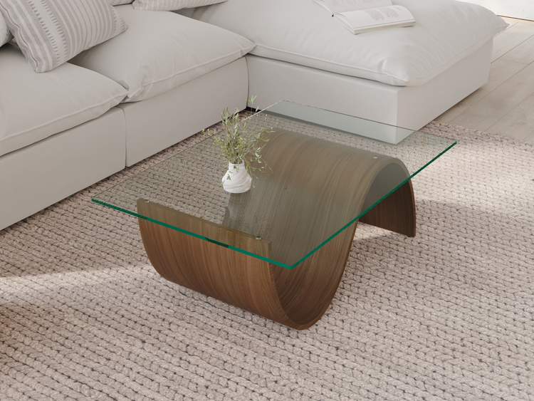 The Pulse Coffee Table, a stylish, flowing design, showcases the natural beauty of wood in a striking, sculptural form. This coffee table's curvaceous, glass-topped silhouette brings a lively and energetic ambiance to your living space. Dimensions: 100cm x 70cm x 38cm high. Walnut natural, available for fast delivery.