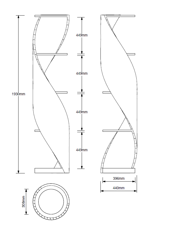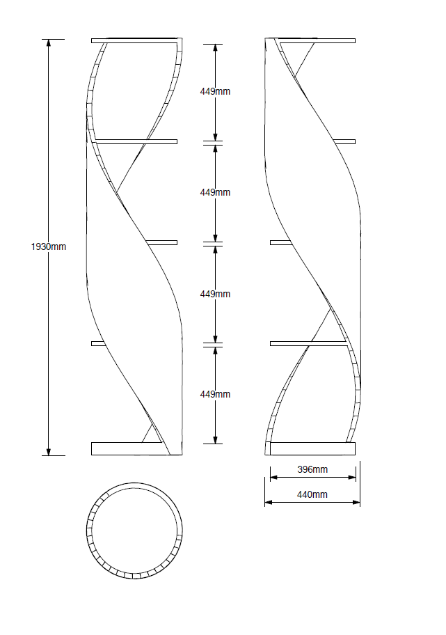 The DNA Shelves, a celebrated design within our collections, draw inspiration from the strand of life. The dramatic, sculptural presence commands attention, making this shelving a captivating focal point. With a single, elegantly curved piece of wood supporting seemingly floating shelves, the DNA Single Strand stands as a striking sculpture, requiring minimal additional decoration. This item can also be made with inset glass shelves. Dimensions: 44cm x 44cm 193cm high.