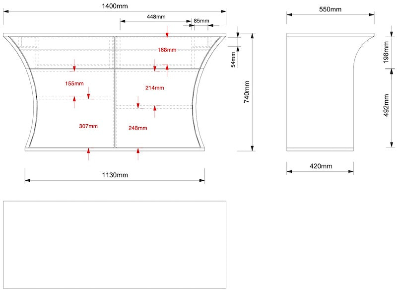 The Estelle Sideboard is characterized by its unique, bowing form, curving inwards on three sides and gradually expanding upwards. This sideboard offers ample internal space, featuring two cupboards, each with two shelves, and two drawers, each with a specialized compartment. Its sculptural design seamlessly blends artistry with practicality. Dimensions: 140cm x 55cm x 74cm high.
