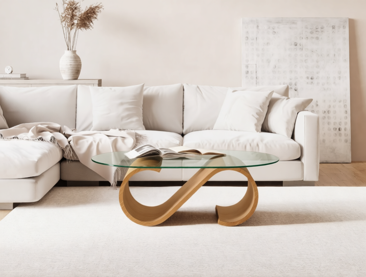 The Swirl Coffee Table, a Tom Schneider design classic, embodies simplicity with its striking, rolling curves. This coffee table's uncluttered design, featuring oval glass top, accentuates the wood's natural beauty.