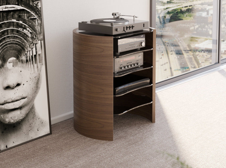 Elevate your audio experience with the Orbit Hi-Fi Rack, a masterpiece of design and functionality. Its five fully adjustable, smoked glass shelves provide a bespoke platform for your audio equipment, allowing for tailored configurations. The meticulously designed shelves promote essential ventilation, guaranteeing optimal operating conditions. Smart cable management preserves this hi-fi unit's sophisticated appearance, keeping your setup impeccably organized. Dimensions: 65cm x 55cm 76cm high.