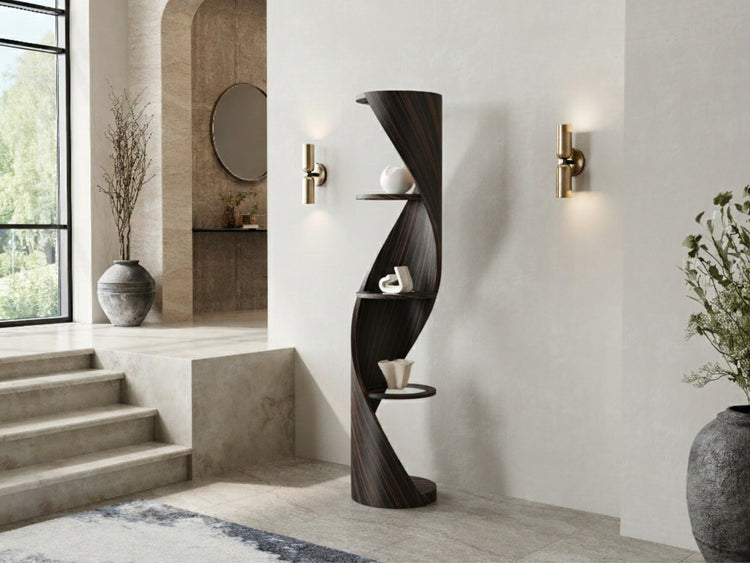 The DNA Shelves, a celebrated design within our collections, draw inspiration from the strand of life. The dramatic, sculptural presence commands attention, making this shelving a captivating focal point. With a single, elegantly curved piece of wood supporting seemingly floating shelves, the DNA Single Strand stands as a striking sculpture, requiring minimal additional decoration. This item can also be made with inset glass shelves. Dimensions: 44cm x 44cm 193cm high.