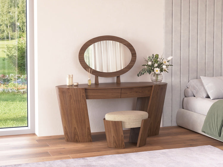 The Pebble Dressing Table/Desk, a testament to modernist design and elegant dressing table functionality, introduces a captivating sense of movement with its truly fabulous, tapered elliptical form, rotating gracefully through a full 360 degrees. Two central drawers and a matching Pebble Stool (Sold separately) provide elegant storage and seating, while the optional mirror transforms this dressing table into a striking vanity or workspace. This versatile piece functions beautifully as both a dressing table and a stylish desk. Dimensions: 178cm x 68cm x 78cm high.