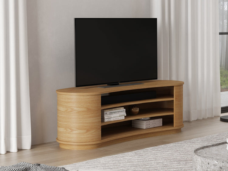 The Radius Media Unit presents a wonderfully playful yet sophisticated design. The media unit's elegant curve, flowing through its form and mirrored at the back, delivers an all-round radiating wow factor. The fixed shelving provides dedicated space for a soundbar and audiovisual equipment, that perfectly balances style with practicality. Dimensions: 155 x 51 x 50 cm. For TV's up to 65 inches. Oak and Walnut held in stock for fast delivery.