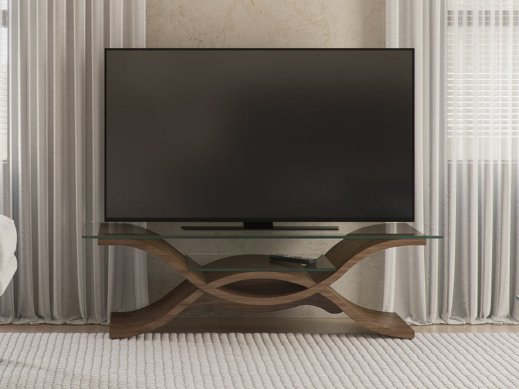 The Wave Media Unit showcases an organic, undulating design, where waves entwine, inspired by the ocean's fluid forms. This media unit, crafted to highlight the natural beauty of wood, features indulgent curves that create a captivating visual. A glass top and a centrally positioned glass shelf, where the waves converge, offer both style and practical storage for media components. Dimensions: 120 x 46 x 37 cm. For up to 50 inch TVs.