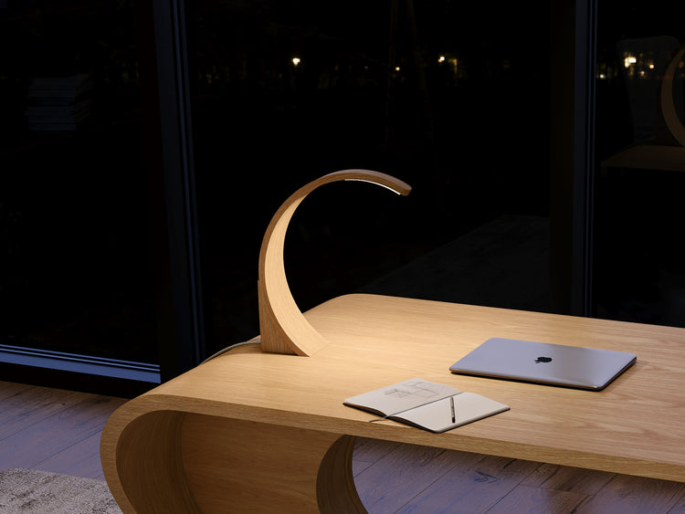 Illuminate your workspace with the Swoop Table Light, an exquisitely designed piece of lighting featuring a striking, arcing form that culminates in a delicate peak. Its clean lines and focused illumination are beautifully paired with the Crest Desk and Poise Dining Chair, creates a visually captivating workspace. Dimensions: 38cm x 13cm x 45cm high. Only available for EU and UK delivery.
