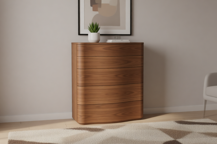 The Serpent Chest of Drawers offers a captivating blend of flowing design and practical storage. Its seamless form, radiates an inherently cool elegance. The chest of drawers are enhanced by push-to-open and soft-close drawers, providing generous bedroom storage and a perfect match for the Serpent collection.