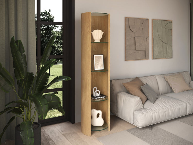 The Saturn Shelves, with its striking open cylindrical form, provide a sculptural display for ornaments and decorative items. Featuring elegant glass shelves and top, its slender profile makes this shelving ideal for enhancing smaller rooms without sacrificing valuable floor space.