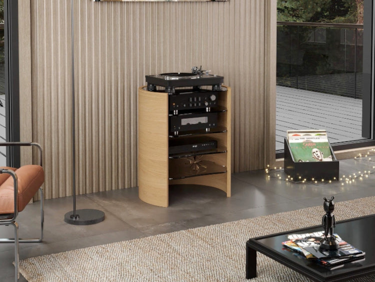 Elevate your audio experience with the Orbit Hi-Fi Rack, a masterpiece of design and functionality. Its five fully adjustable, smoked glass shelves provide a bespoke platform for your audio equipment, allowing for tailored configurations. The meticulously designed shelves promote essential ventilation, guaranteeing optimal operating conditions. Smart cable management preserves this hi-fi unit's sophisticated appearance, keeping your setup impeccably organized. Dimensions: 65cm x 55cm 76cm high. Oak natural held in stock for fast delivery.